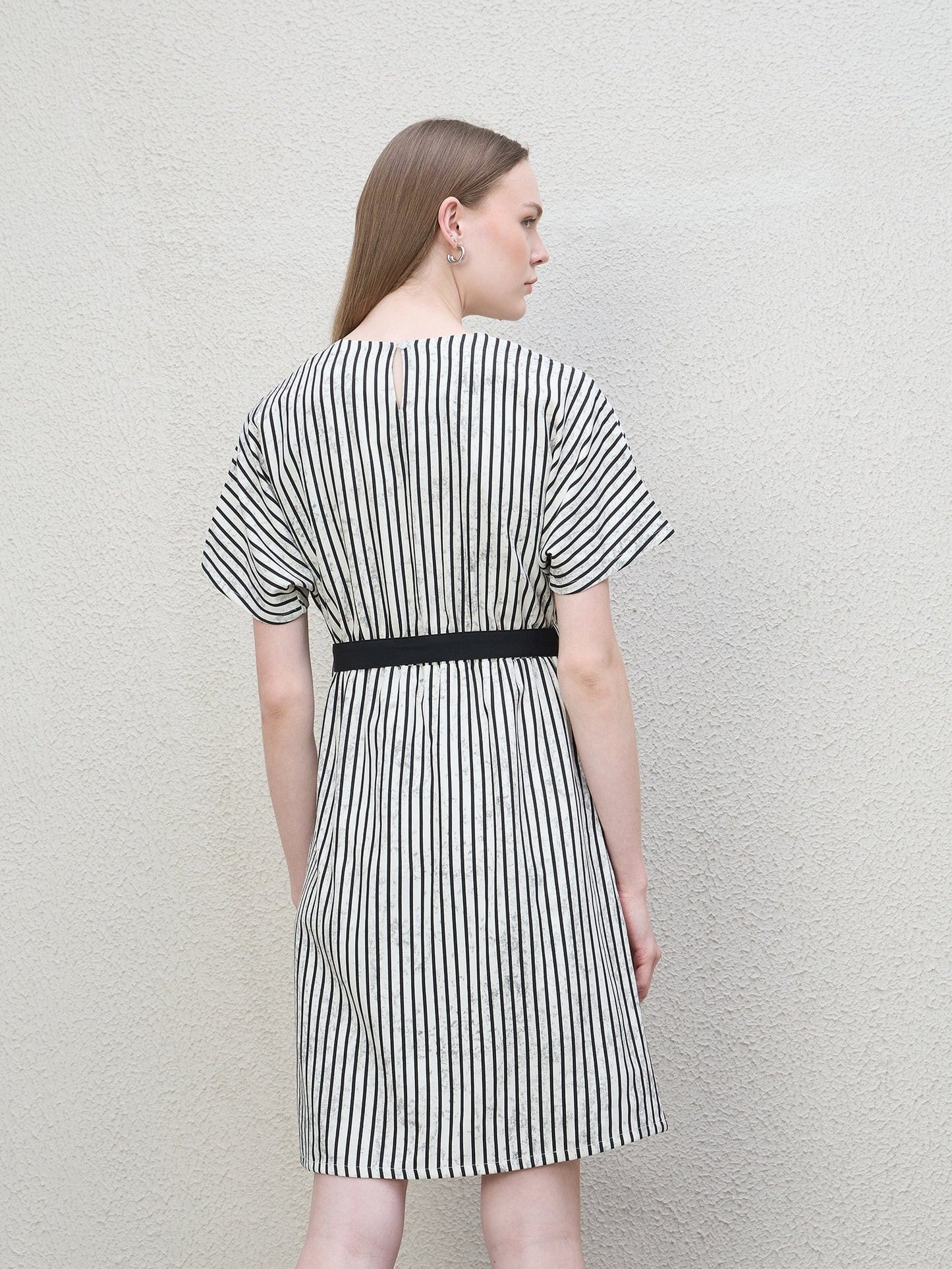 Discover the elegance of our black a-line dress, designed to enhance your wardrobe with its chic stripe play pattern. This kimono-inspired dress features a flattering straight-in striped design that adds a touch of sophistication to any occasion. Crafted from high-quality polyester fabric, it offers comfort and durability for all-day wear. The short sleeves and round neck provide a classic silhouette, while the button closure ensures a secure fit. Perfect for both casual outings and formal events, this versatile dress is a must-have for any fashion-forward woman seeking style and grace.