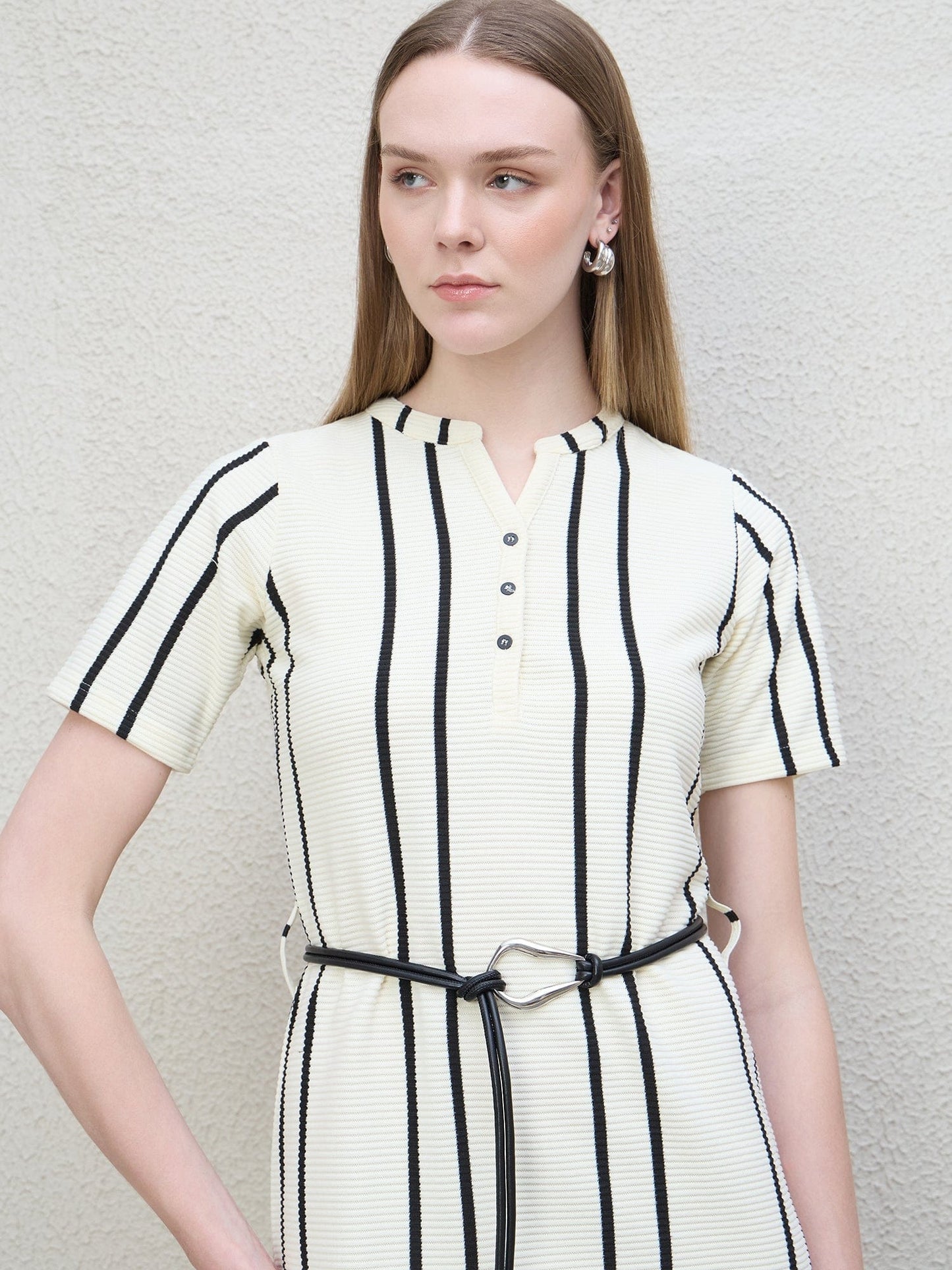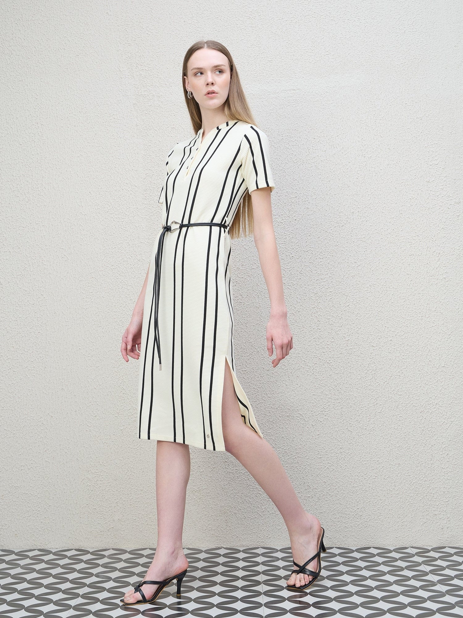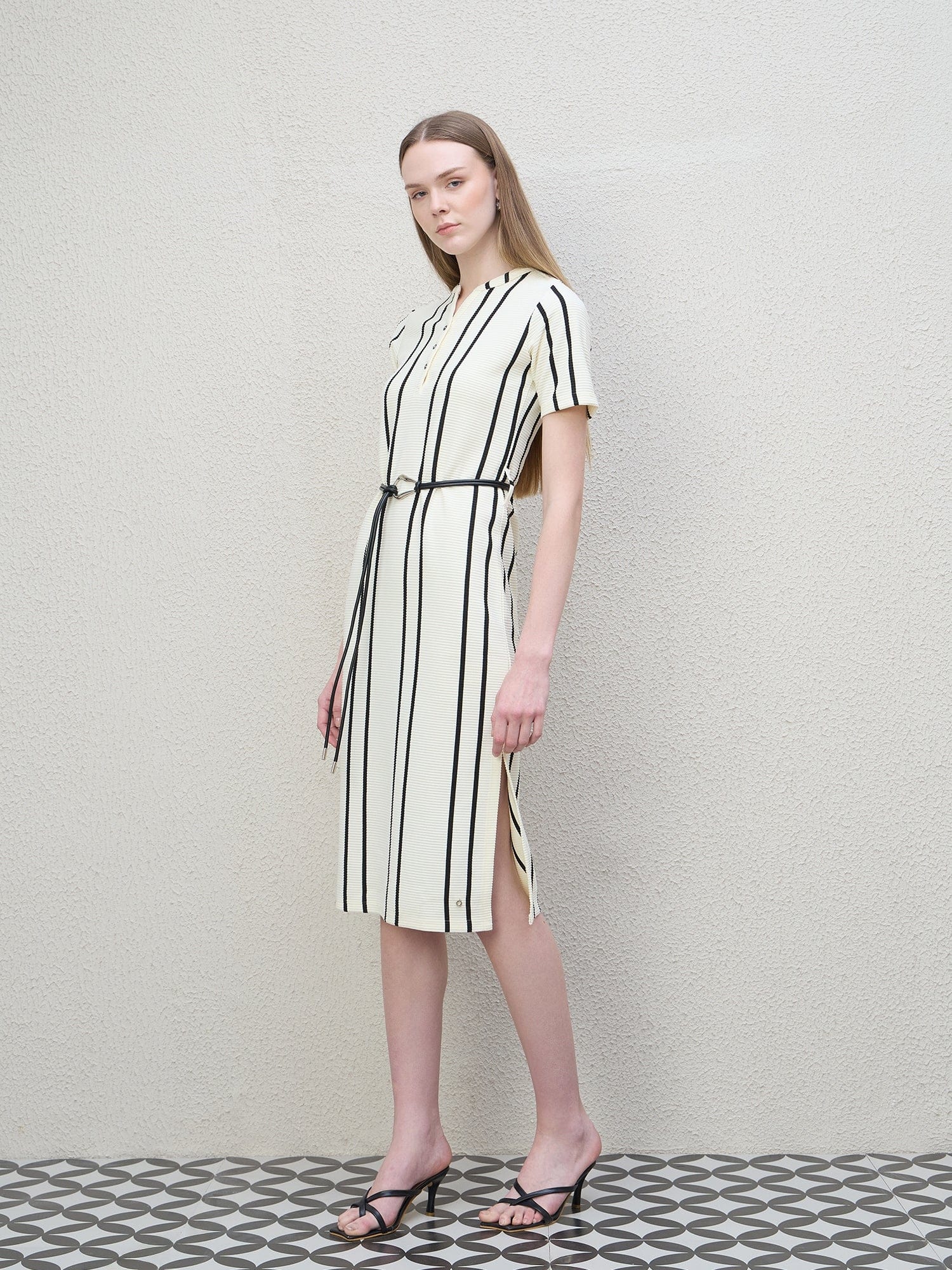 Elevate your wardrobe with this chic white midi dress, designed for the modern woman who values style and comfort. Crafted from pure cotton fabric, this dress features a flattering body fit with a classic striped pattern that adds a touch of sophistication. The short sleeves and v-placket band enhance its elegant appeal, while the button closure ensures ease of wear. An added belt accentuates your waistline, offering a tailored look. The knit stripes are stretchable, providing flexibility and comfort throughout the day. Perfect for any occasion, this dress is a versatile addition to your collection.