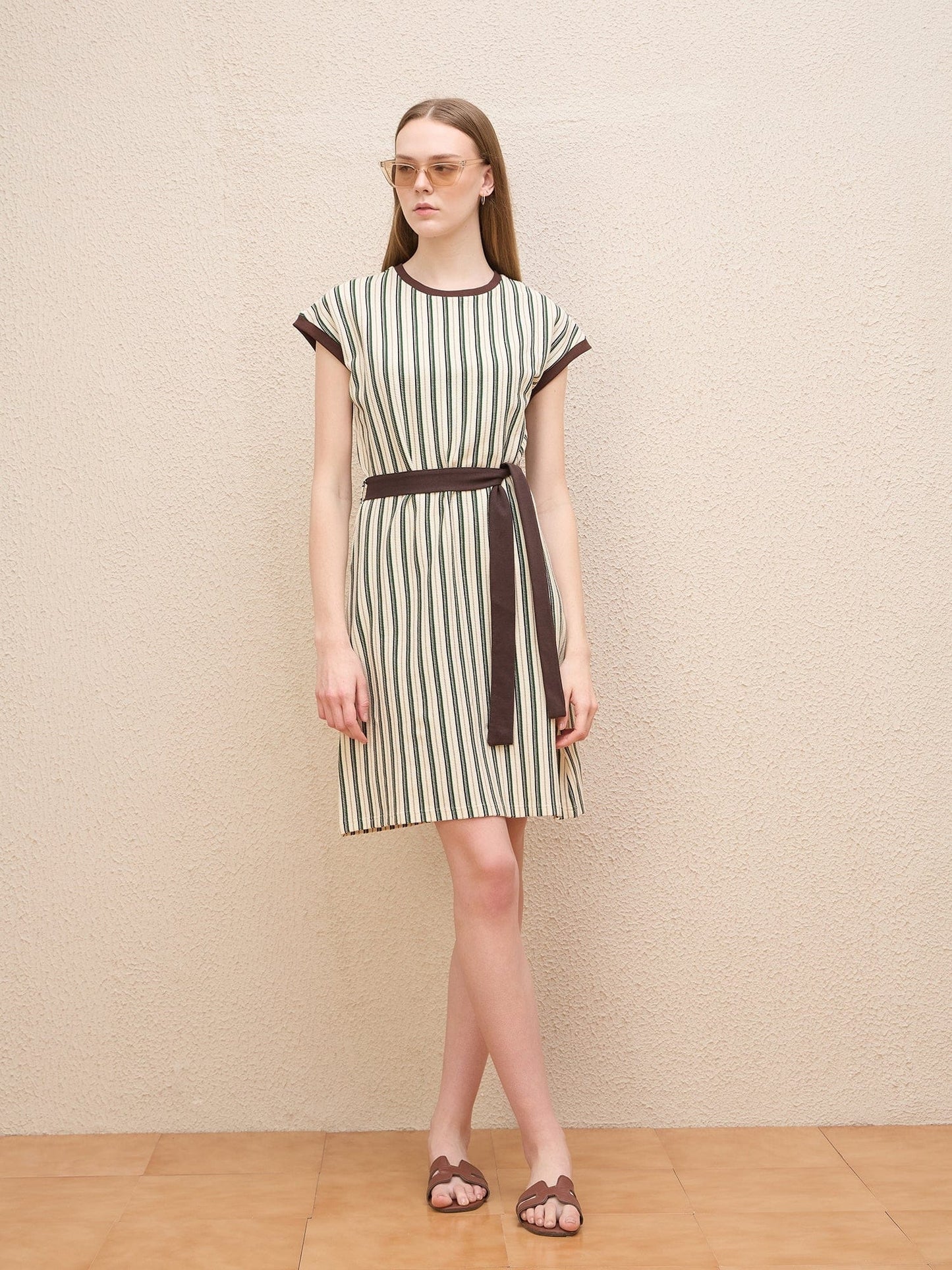 Discover effortless style with our brown t-shirt dress, designed for women who appreciate comfort and elegance. Crafted from pure cotton fabric, this dress features a straight cut with a chic striped pattern, offering a timeless look for any occasion. The structured fabric ensures durability while the rib neck adds a touch of sophistication. With its short sleeves and pull-on closure, this dress provides ease of wear and versatility. The stretchable material adapts to your silhouette, ensuring a flattering fit every time. Perfect for casual outings or relaxed gatherings, this t-shirt dress is a wardrobe essential.