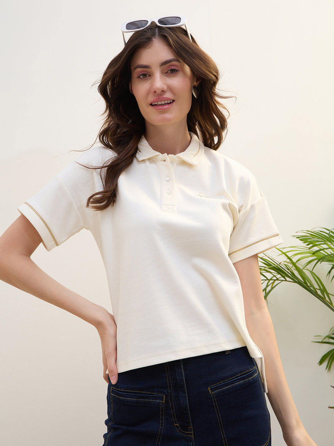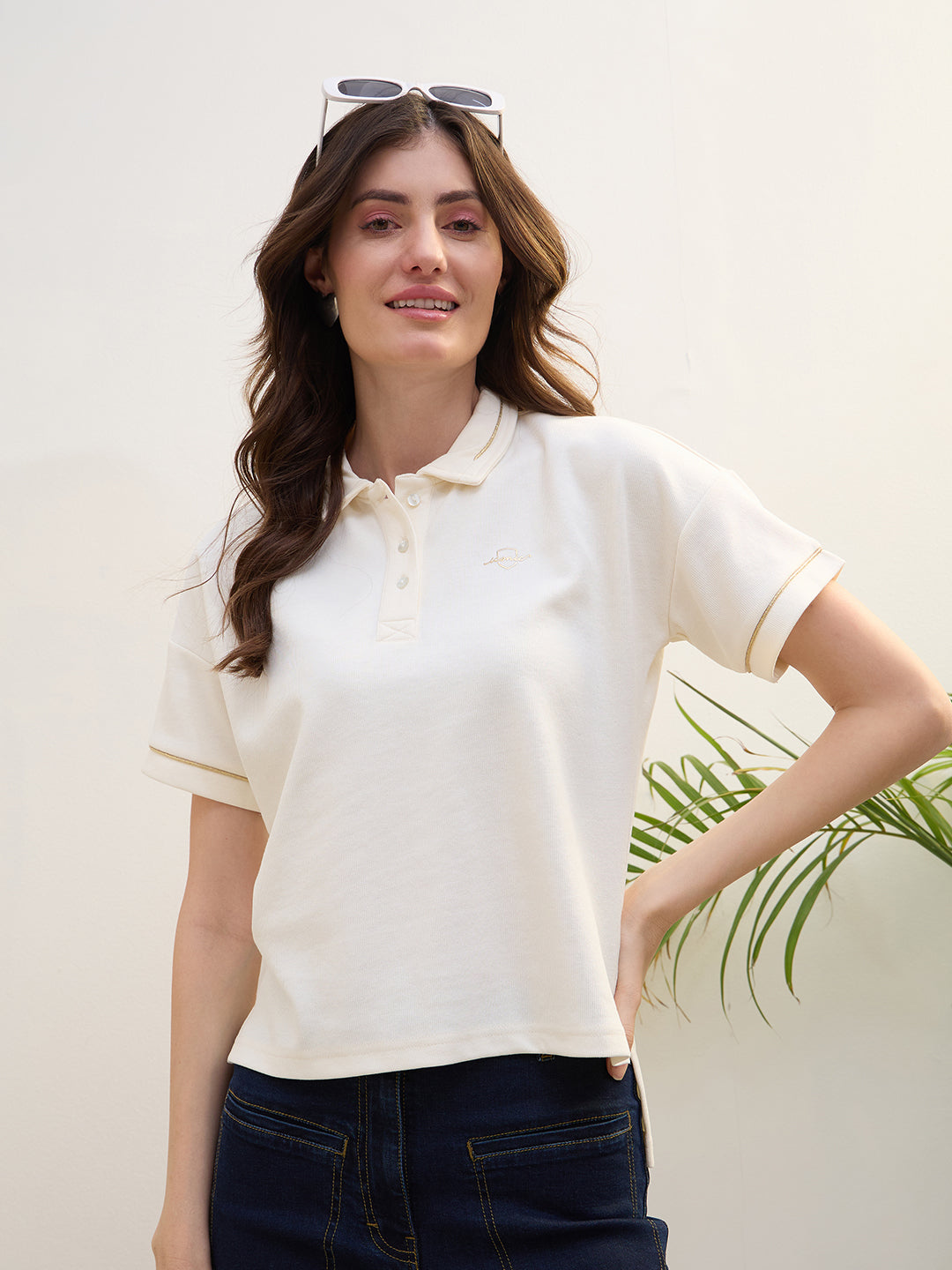 Discover the perfect blend of style and comfort with our golden lurex piping stretchable t-shirt in a classic white hue. Designed for women who appreciate elegance, this t-shirt features a straight solid pattern that complements any wardrobe. The short sleeves and polo collar add a touch of sophistication, while the pure cotton fabric ensures breathability and comfort. The button closure offers a polished finish, making it ideal for both casual outings and more formal occasions. Elevate your everyday look with this versatile piece.