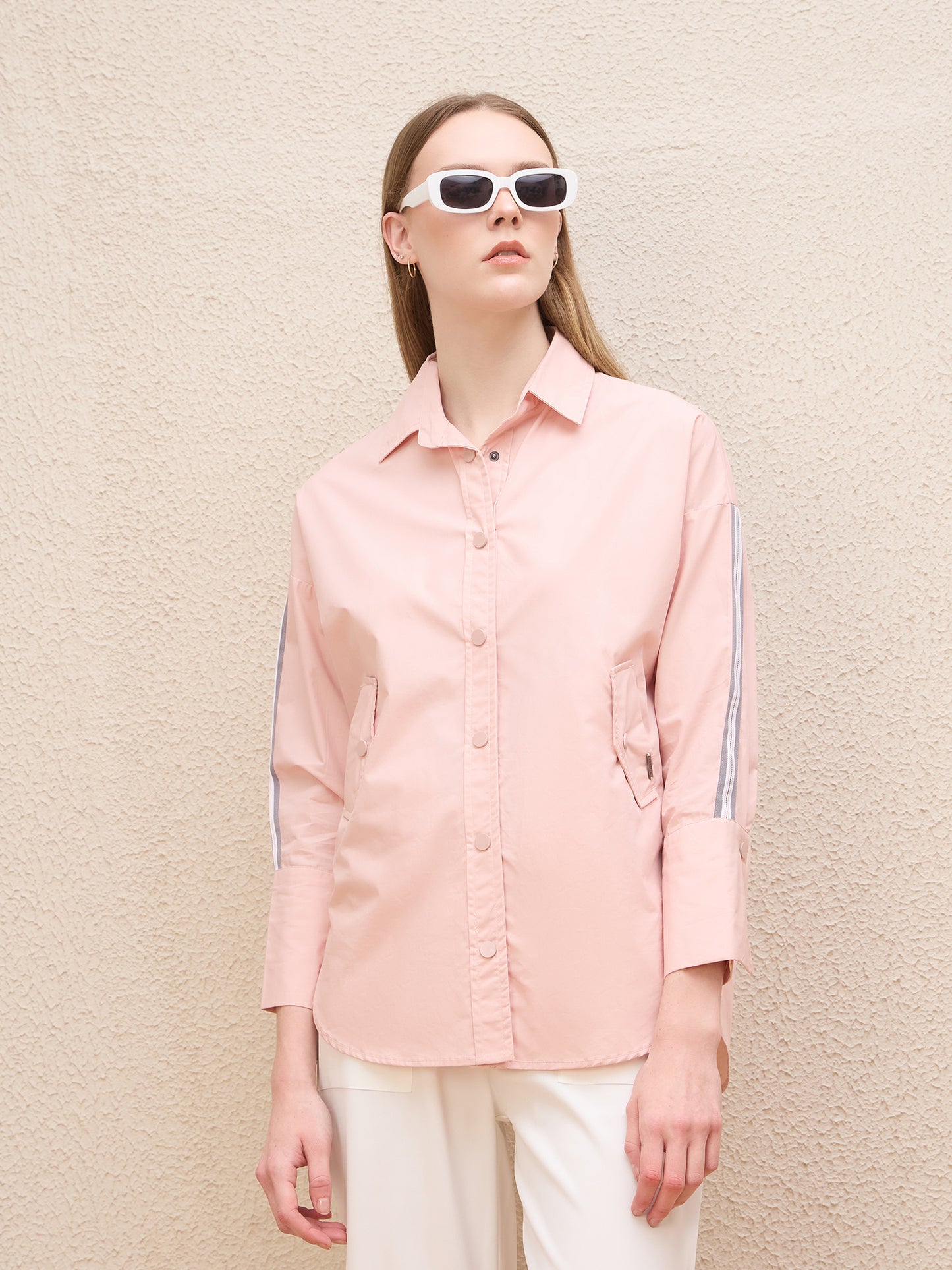 Introducing our stylish oversized pink shirt, designed for women who appreciate both comfort and fashion. Crafted from pure cotton fabric, this shirt offers a soft and breathable feel, perfect for all-day wear. The solid pattern adds a touch of elegance, while the full sleeves and collared neck provide a classic look. Featuring button closure for easy wear, this shirt also includes shoulder taping to enhance its structure and style. Ideal for casual outings or office settings, this versatile piece effortlessly elevates your wardrobe with its chic and timeless appeal.