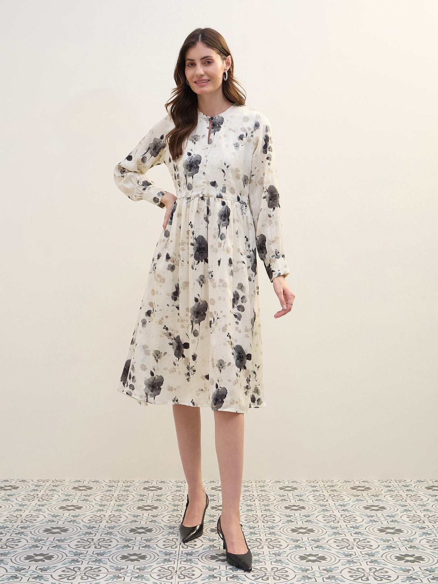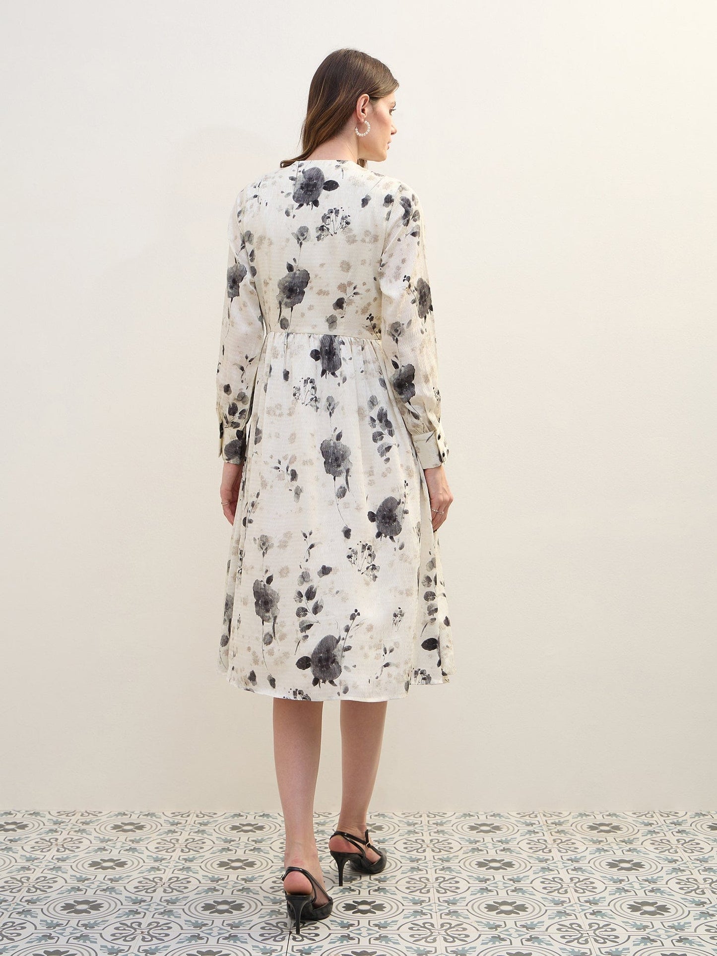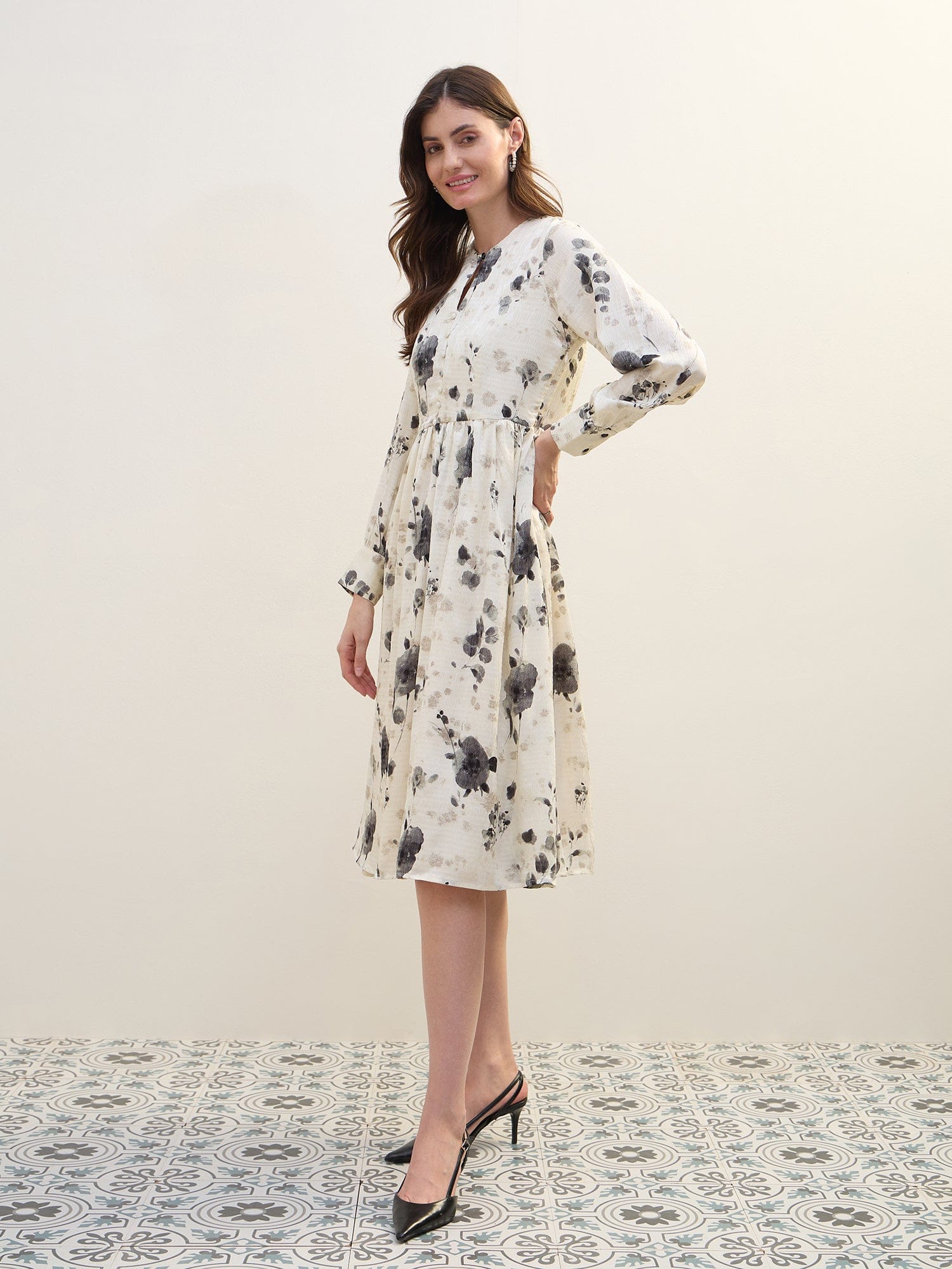 Discover elegance with our monochrome fit and flare dress in a timeless white hue. Crafted from pure cotton, this dress offers comfort and breathability, perfect for any occasion. The full sleeves and round neck design add a touch of sophistication, while the floral pattern brings a hint of femininity. Featuring a convenient button closure, this dress ensures a secure fit. Ideal for both casual outings and formal events, it effortlessly combines style and practicality, making it a must-have in your wardrobe.
