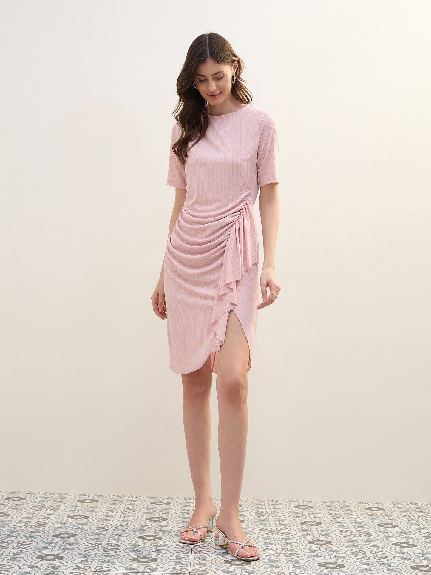 Discover elegance with our stretchable cocktail dress in a stunning pink hue. Designed to flatter, this body-hugging dress features a structured pattern that enhances your silhouette. The half sleeves and round neck offer a classic touch, while the pure cotton fabric ensures comfort and breathability. A discreet zipper closure at the back provides a seamless fit. Perfect for any occasion, this dress combines style and ease, making it a must-have addition to your wardrobe. Embrace sophistication and charm effortlessly.