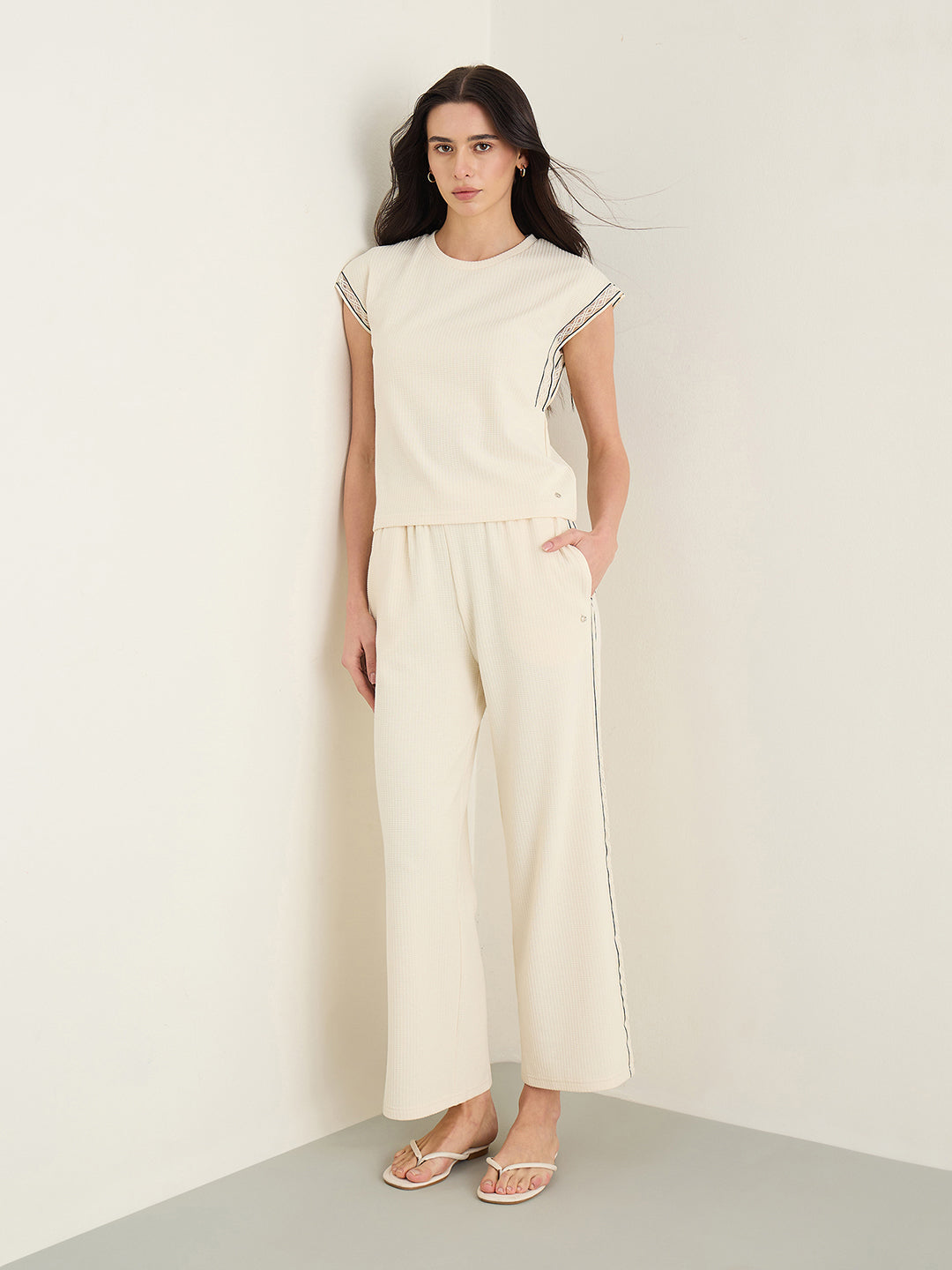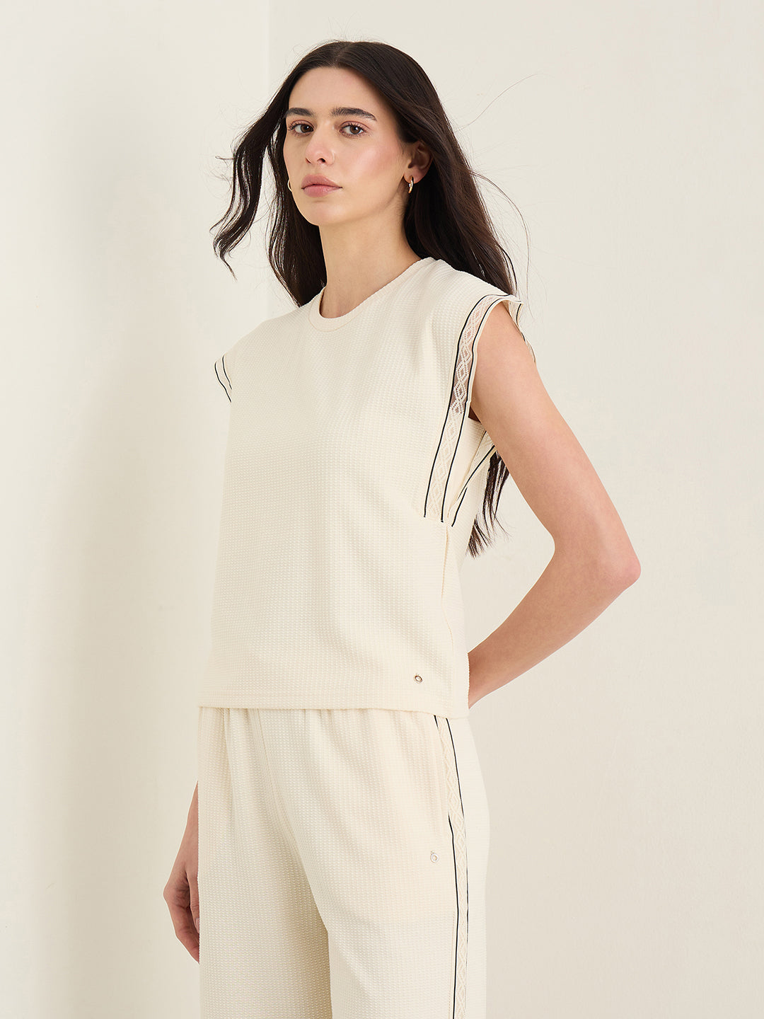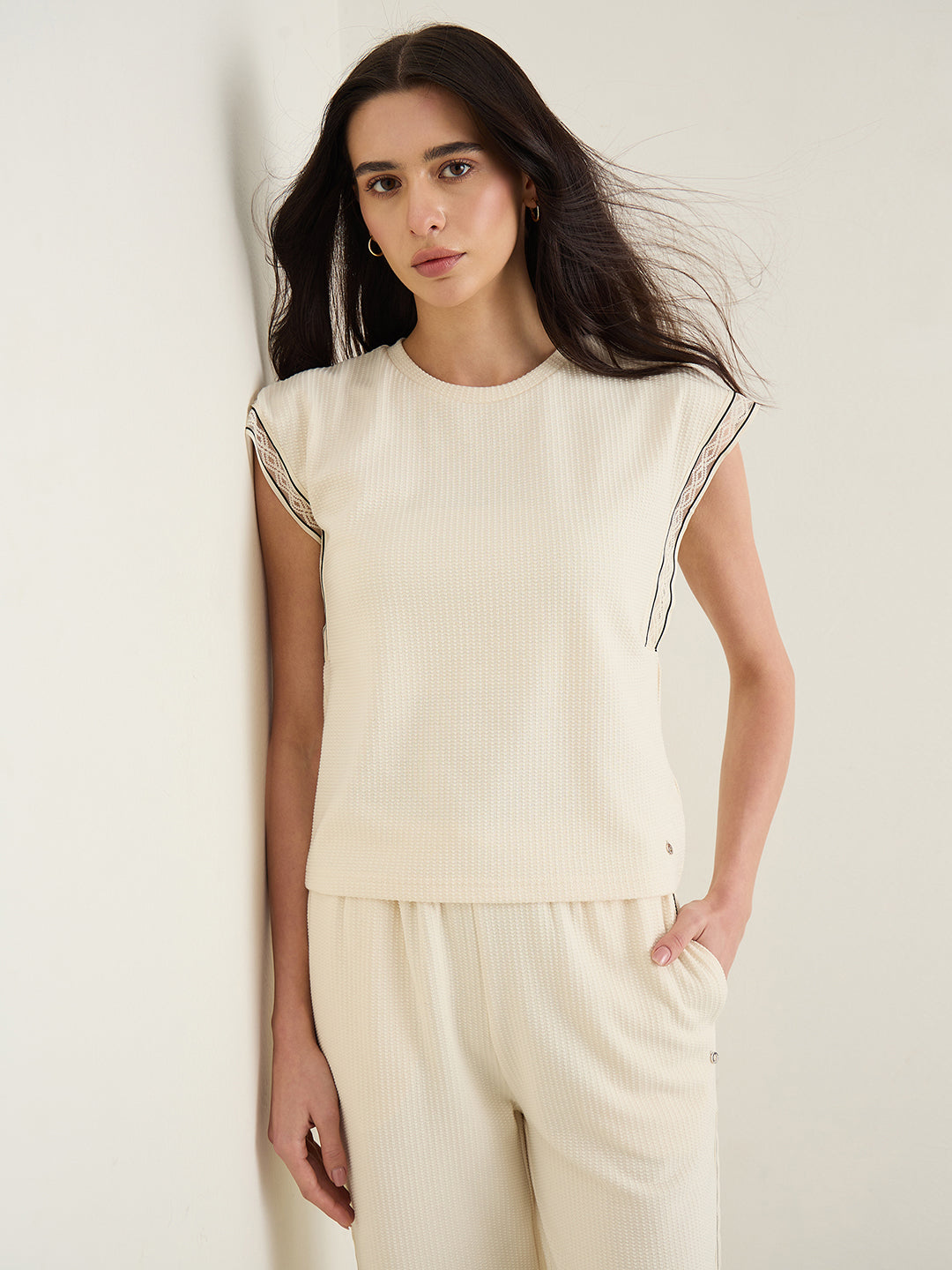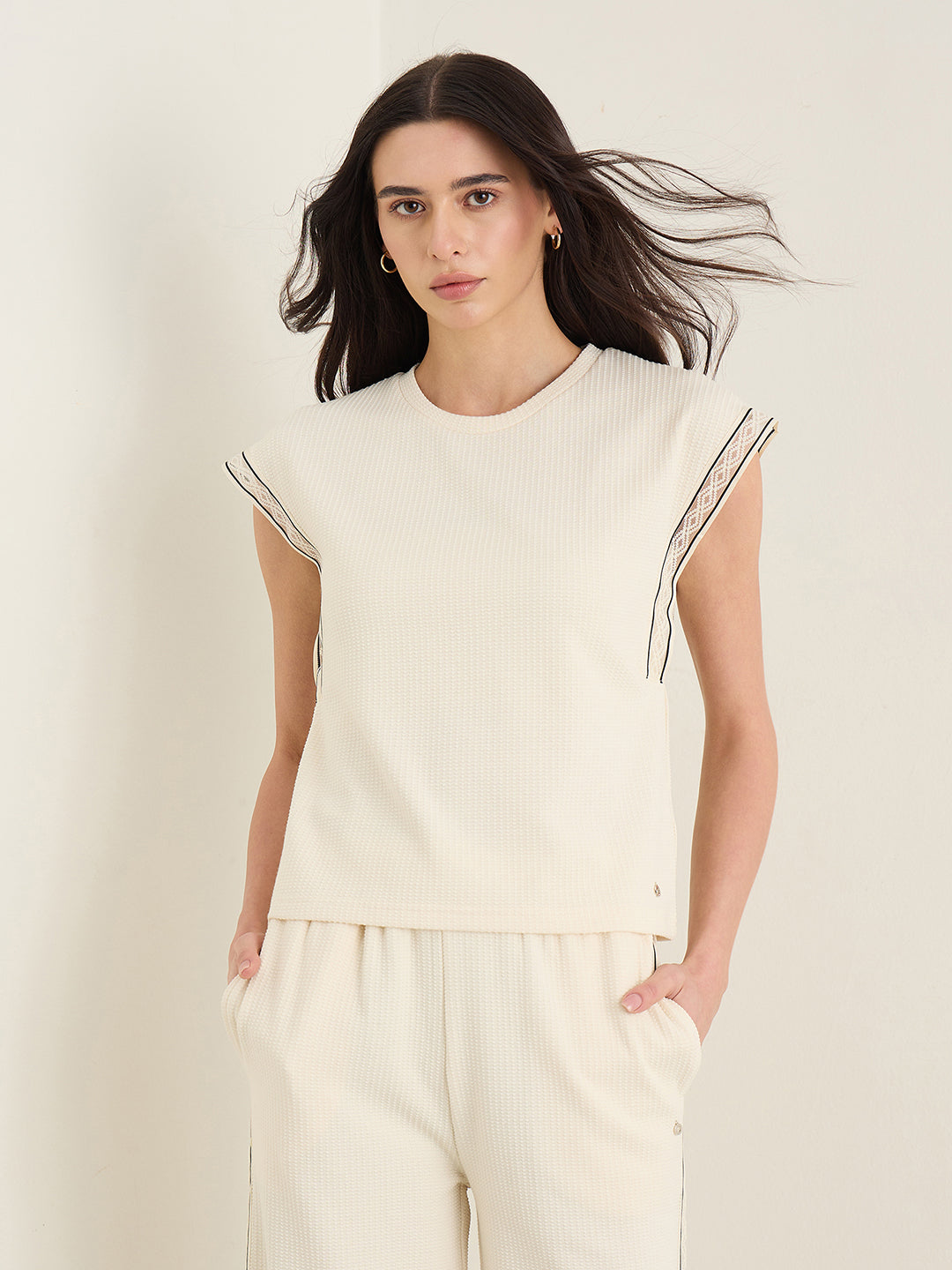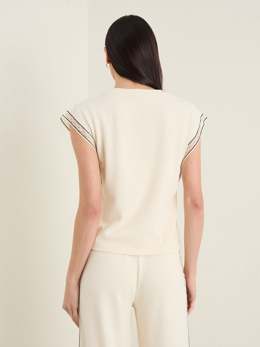 Womens Cream Woven Design Round Neck Top