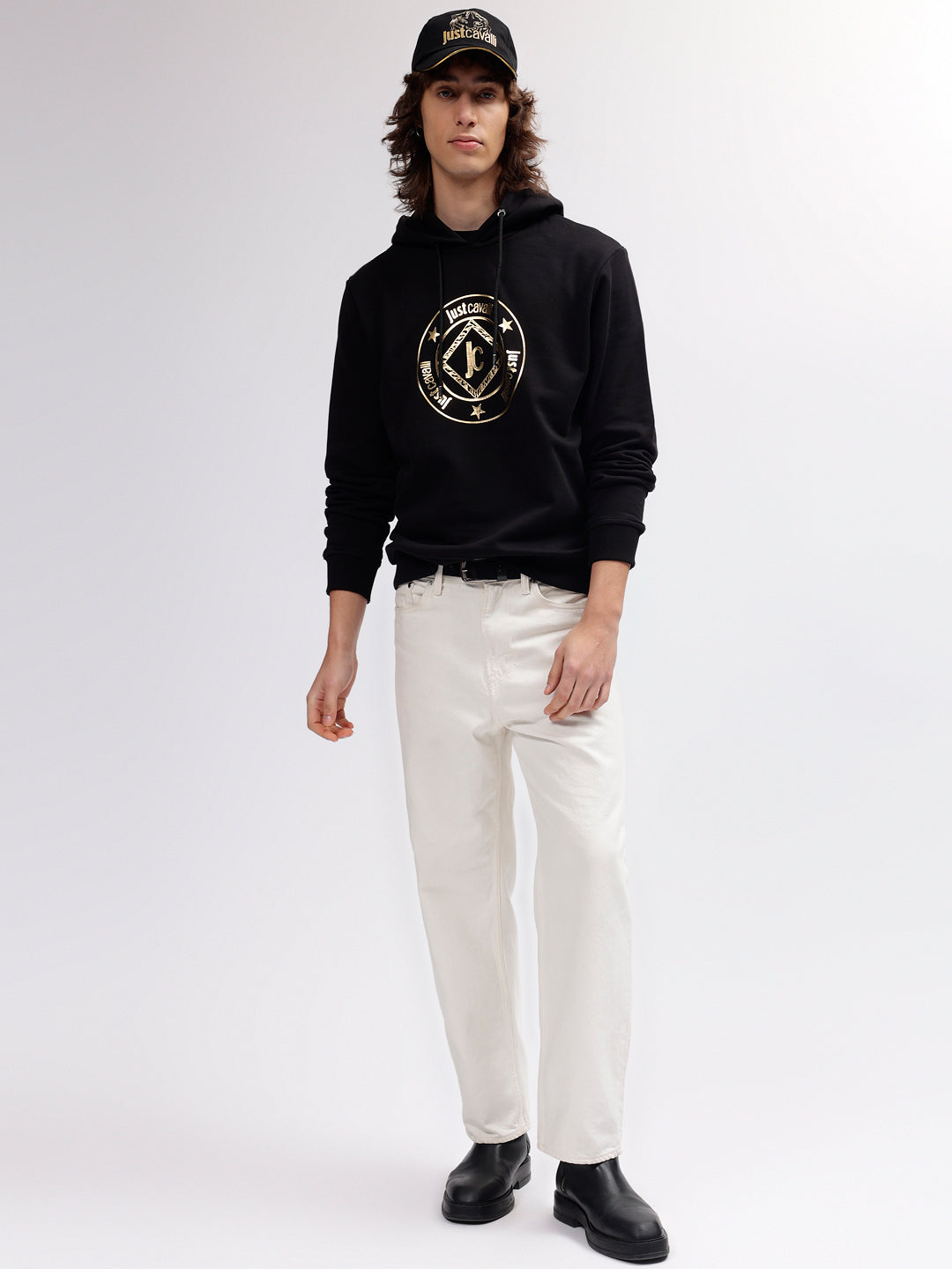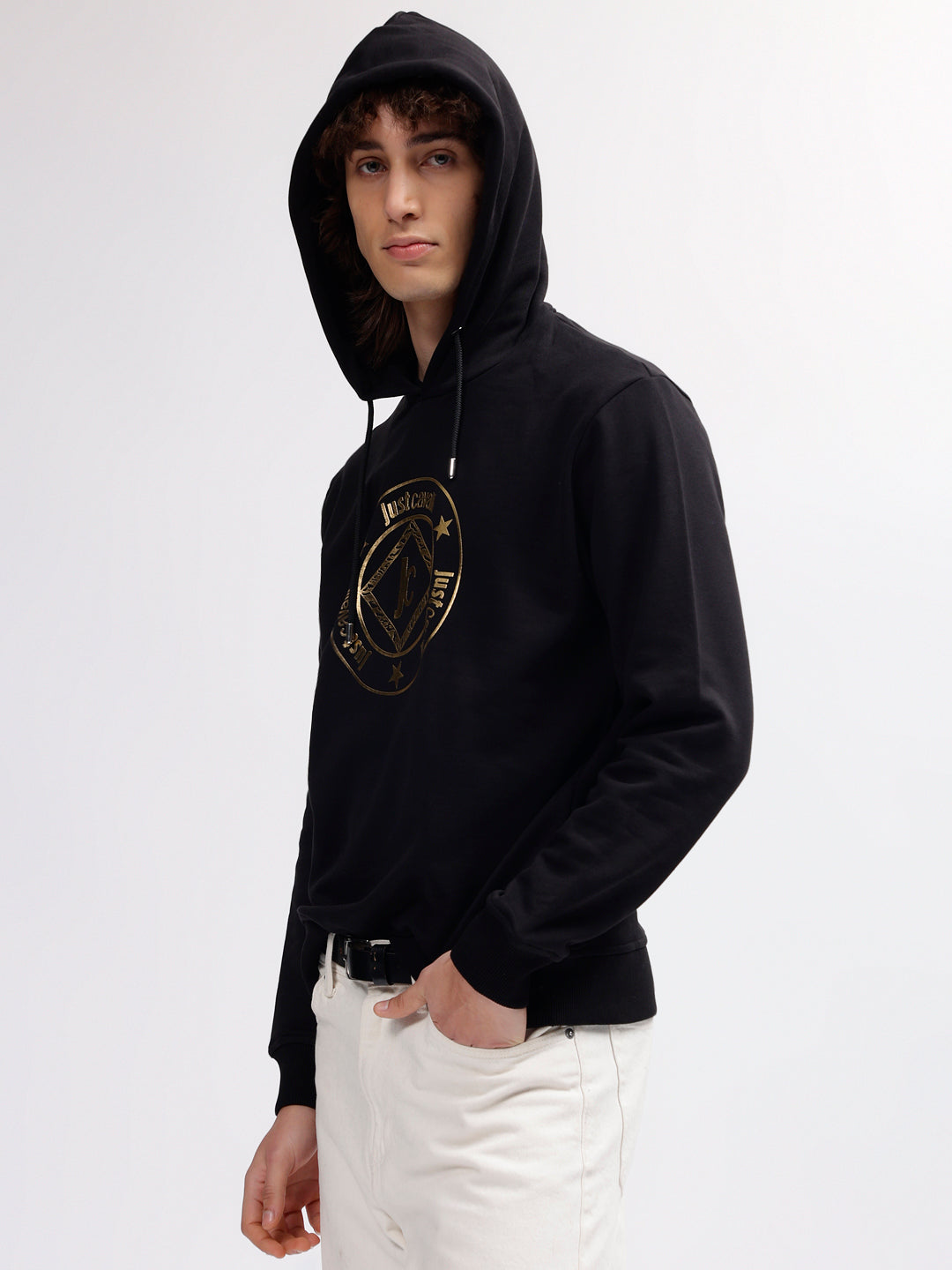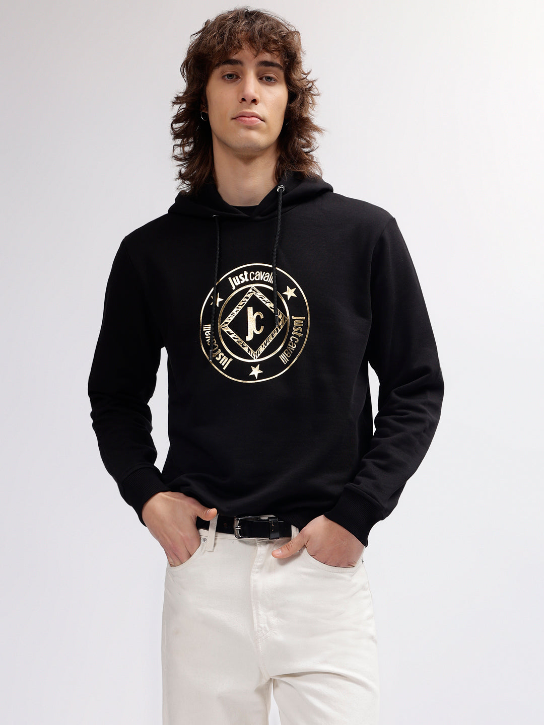Just Cavalli Men Black Printed Hooded Full Sleeves Sweatshirt