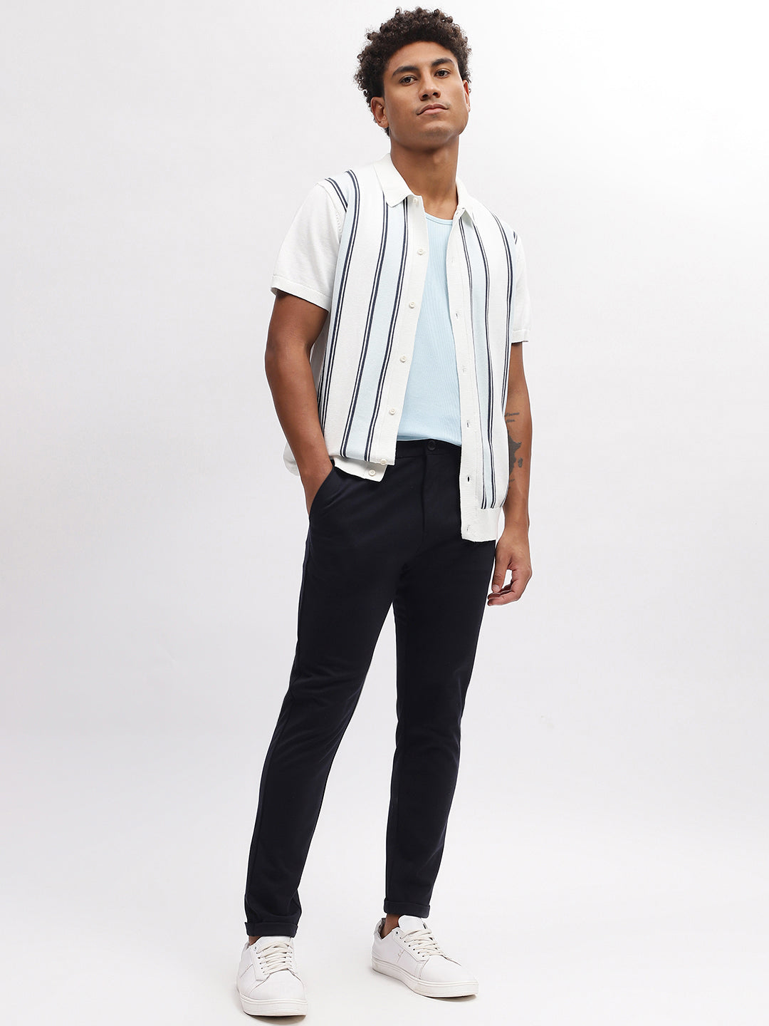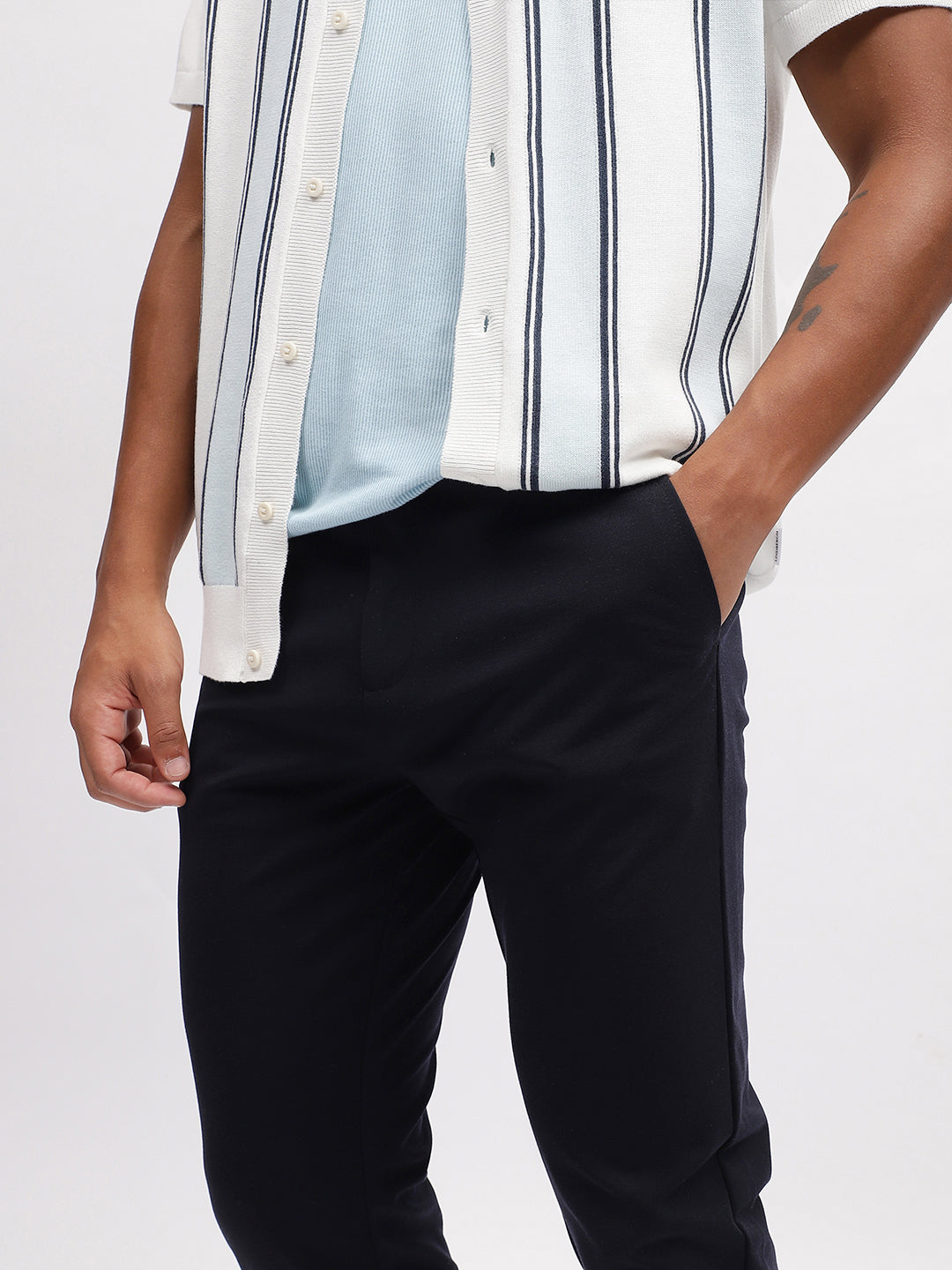 Step into sophistication with our navy blue trousers, tailored for the modern man. The slim-fit design and solid pattern exude elegance, while the classic button and zipper closure ensure a seamless fit. Perfect for any occasion, these trousers are a wardrobe essential for the style-conscious gentleman.