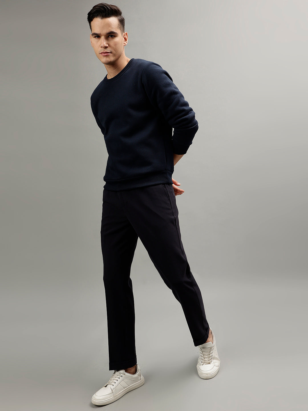 Men Navy Blue Solid Mid-Rise Regular Fit Regular Trouser