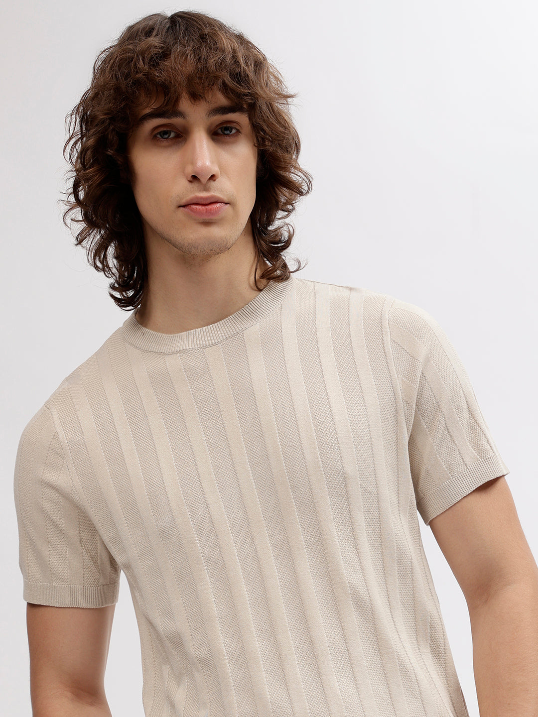 Step up your style game with this effortlessly cool beige t-shirt. Crafted with a regular fit, it features an intricate solid pattern that adds a touch of sophistication. Made from a blend of 70% Viscose and 30% Nylon fabric, this tee offers ultimate comfort. With short sleeves, a round neck, and a convenient slip-on closure, it's the perfect addition to your wardrobe.