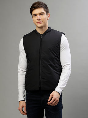 Introducing our sleek and versatile sleeveless jacket in solid black. Designed with a stand collar and a relaxed fit, this jacket effortlessly combines style and comfort. Perfect for layering or wearing on its own, its a must-have addition to your wardrobe.