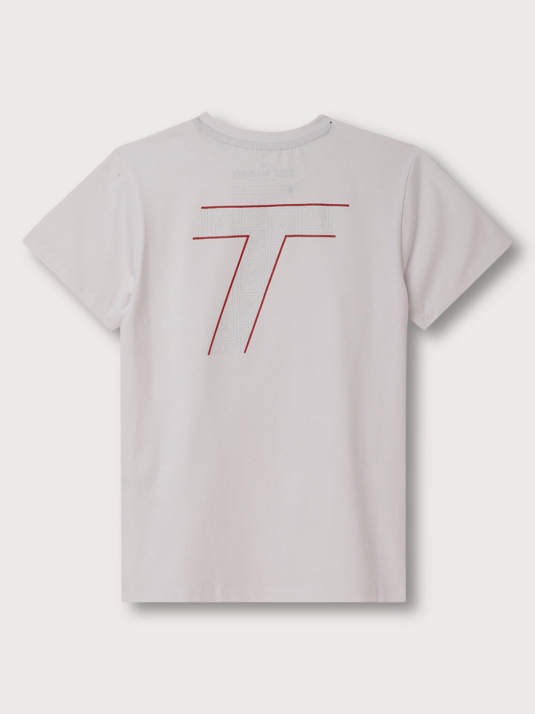 Introducing the iconic True Religion Boys White Solid Round Neck T-Shirt. Crafted with 92% cotton and 8% elastane, this 215 GSM t-shirt is perfect for any occasion.