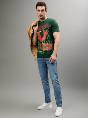 Introducing our stylish Green Printed T-Shirt! Designed with a Round Neck and Half Sleeves, this Regular Fit tee is perfect for any casual occasion. The vibrant print adds a touch of personality to your outfit, making it a must-have for fashion-forward individuals.