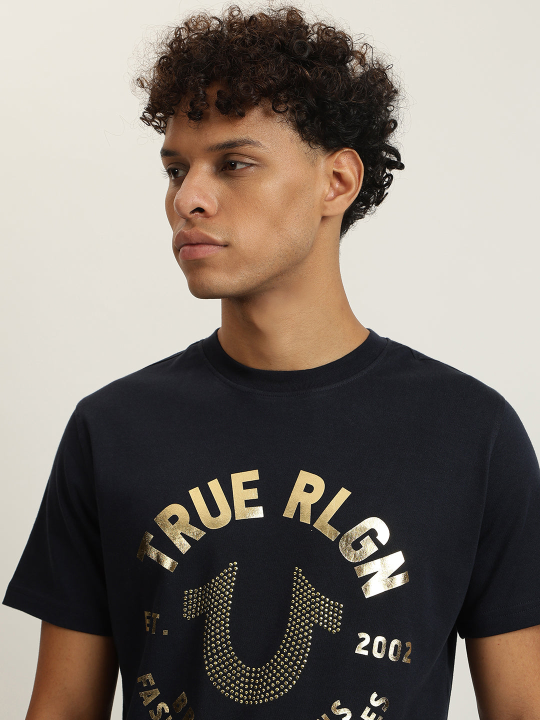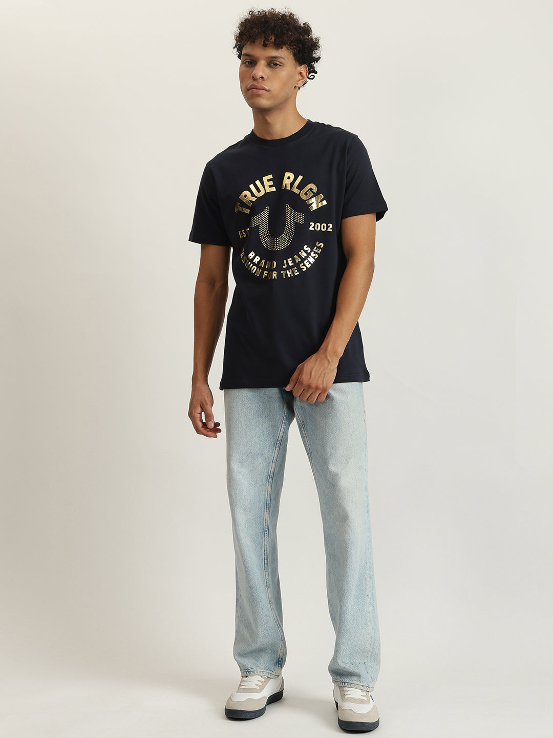 This classic navy blue t-shirt is a wardrobe essential. Made from soft, breathable cotton, it features a comfortable regular fit, short sleeves, and a round neck. The printed pattern adds a touch of style, while the pull-on closure makes it easy to wear.