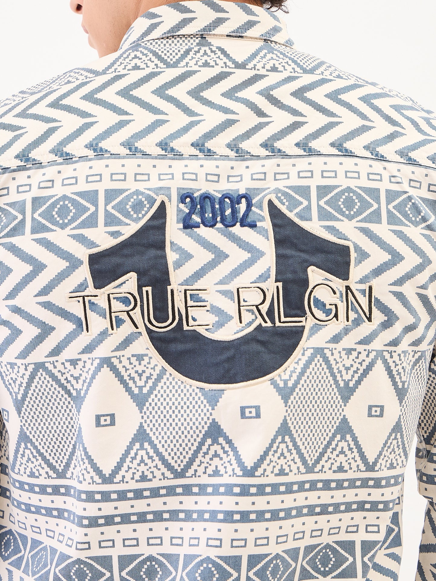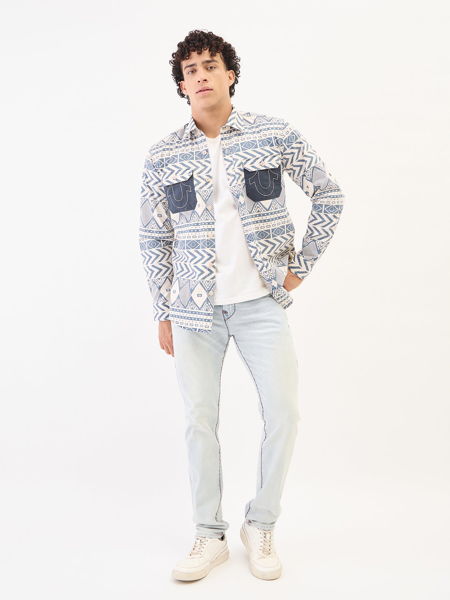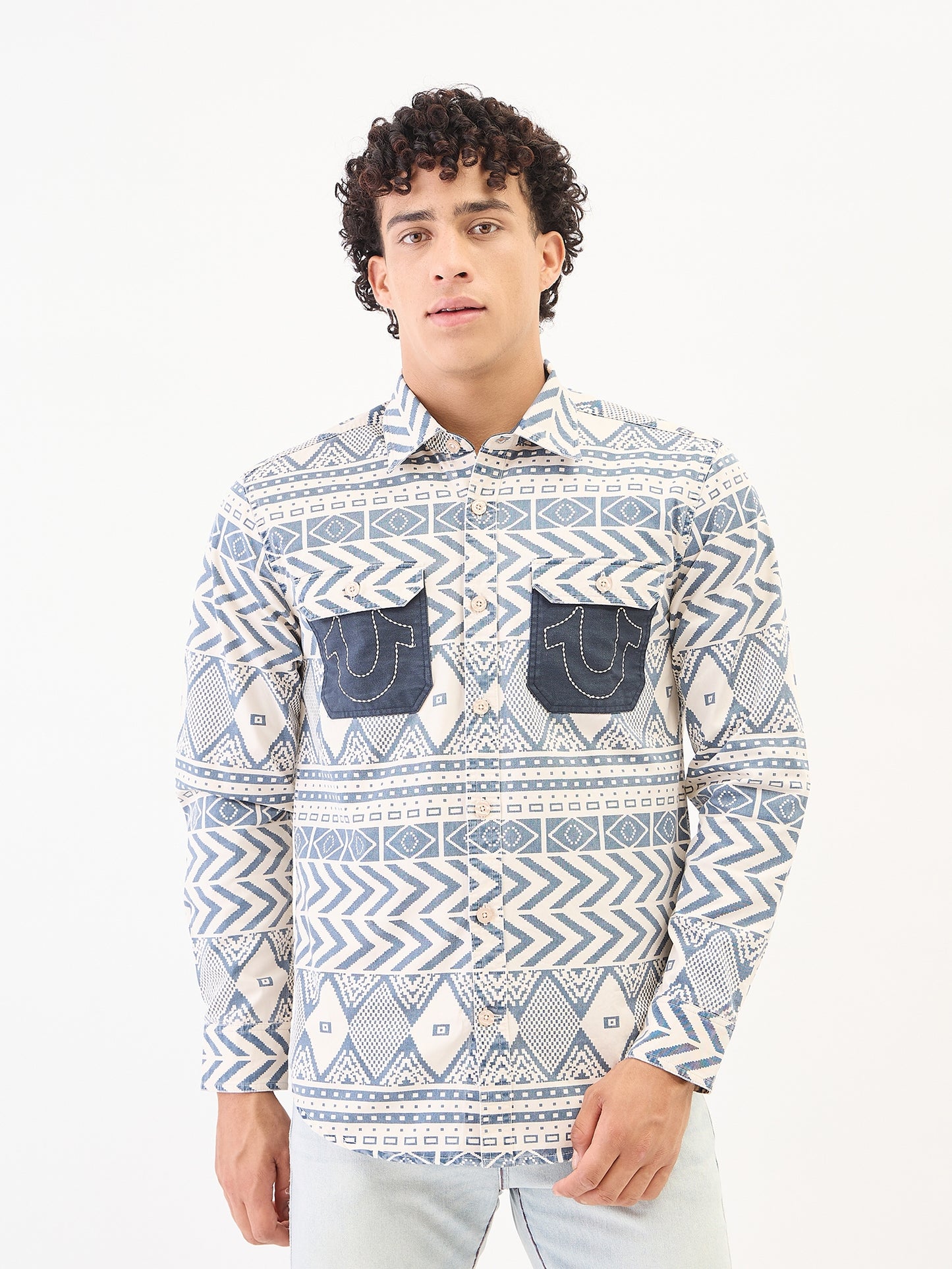 Discover the perfect blend of style and comfort with our utility shirt in a striking blue geometric pattern. Designed for the modern man, this regular fit shirt features full sleeves and a classic spread collar, offering a timeless look suitable for any occasion. Crafted from pure cotton fabric, it ensures breathability and all-day comfort. The button closure adds a touch of sophistication, making it easy to dress up or down. Whether for work or casual outings, this shirt is a versatile addition to your wardrobe.