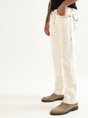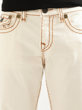 True Religion Men's Ivory Straight Fit Jeans are crafted from pure cotton for a classic, iconic look. Featuring fading, 3D whiskering, and Super T stitching, these jeans are a timeless wardrobe staple.
